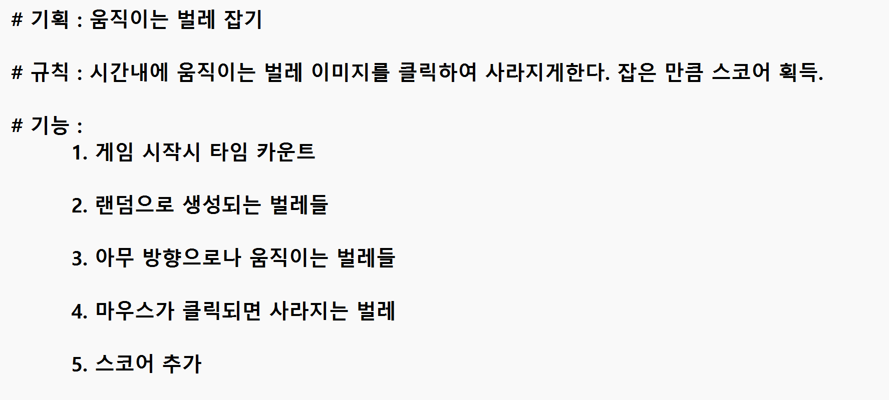 개인 프로젝트 : pygame을 이용해서 간단한 게임 만들기 4월 25일 부터 2.5일간, 그동안 배운 파이썬 문법을 이용해서 간단한 게임을 만드는 프로젝트를 진행하였다. 처음엔 내 수준을 너무 과대평가하여 팩맨을 만들어보려 했으나, 맵을 그리며 장애물 처리와 맵에 뿌려져있는 팩맨의 먹이를 코딩하다 큰 벽을 느끼고 주제를 바꿨다.. 팩맨에 이미 2.5일중 절반을 넘게 소모했기에 급하게 벌레잡기 게임으로 주제를 바꿔 진행하였다. - 규칙 : 먼저 간단하게 규칙을 정했다. 시간내에 사방으로 움직이는 벌레들을 마우스 클릭으로 제거하며, 제한시간동안 스코어를 쌓는 것이 게임방식이다. - 구현할 기능 : 규칙을 보며 필요한 기능들을 쪼개보았다. 핵심기능들이 다섯가지정도가 되었다. 기능 하나하나 완성된 코드를 보며..