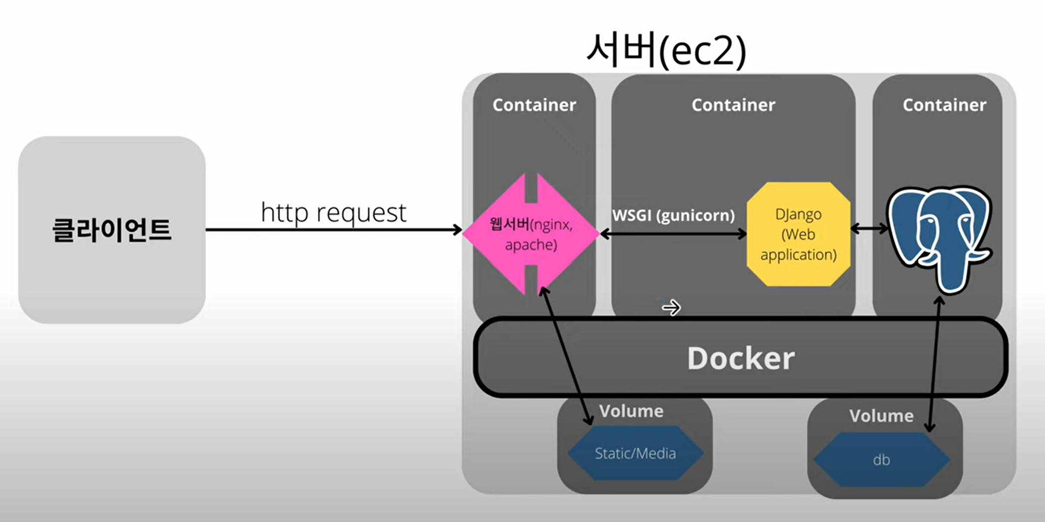 Nginx / Gunicorn 의 역할 python manage.py runserver 는 개발용 서버이기 때문에 디버깅이 찍히고 대량의 트래픽, static 파일들을 서빙하는데에는 문제가 있다. 따라서 배포를 할때는 runserver 대신 nginx 서버와 연동이 필요하다. nginx 와 django 연결을 가능케 하는게 gunicorn(웹서버게이트웨이인터페이스) 이다. gunicorn 연결하기 1) 배포용 docker-compose 만들기 docker-compose.prod.yaml 파일 생성 2) gunicorn 설치 pip install gunicorn 3) freeze pip freeze > requirements.txt 4) docker-compose.prod.yaml 작성 command: g..